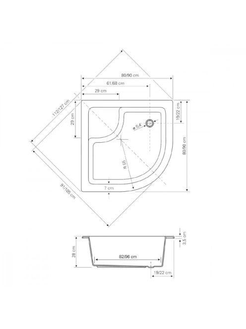 Aqualine mély íves zuhanytálca túlfolyóval 90x90x28 cm, fehé
