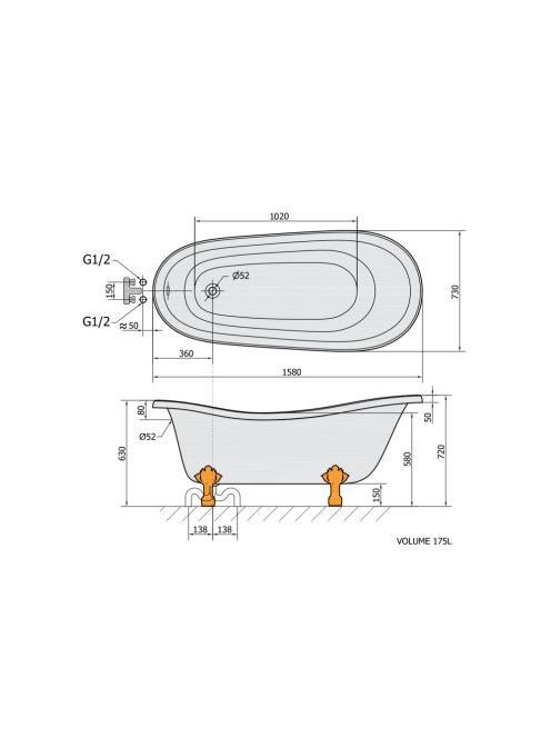 Polysan Rectime szabadonálló kád 160x73 cm, króm lábbal 37122