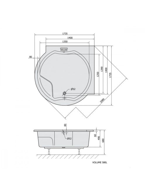 Polysan Royal sarok akril kád 173x173x49 cm, fehér 74211 - F