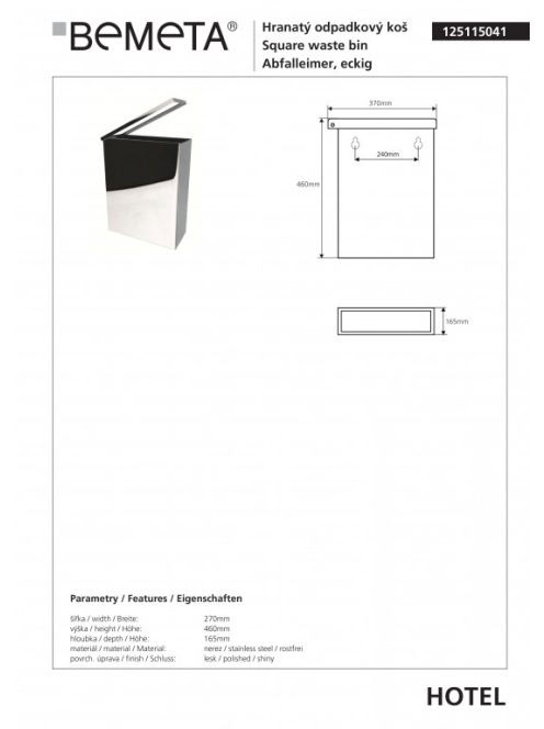 Bemeta Hotel szemetes falra szerelhető 25l, fényes inox (125Bemeta Hotel szemetes falra szerelhető 25l, fényes inox (125