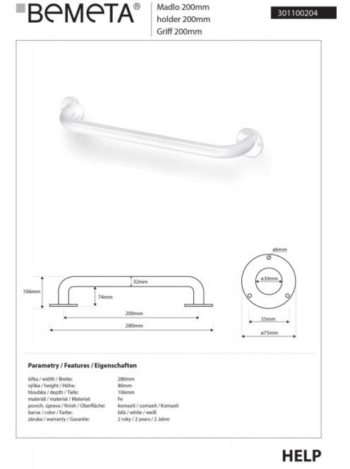 Bemeta Help Kapaszkodó 200 mm, fehér (301100204) XH505W