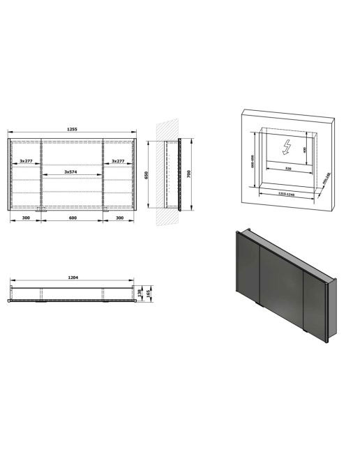 Sapho Integra falba építhető tükrös szekrény 125,5x70x16,5 c