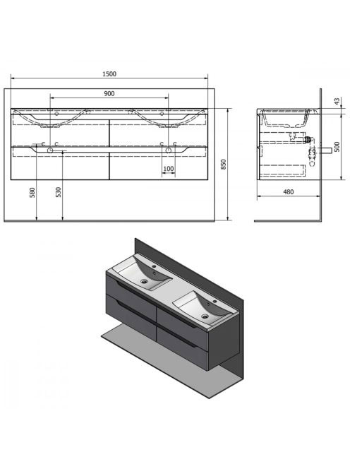 Sapho Wave II négy fiókos mosdótartó szekrény 150x50x48 cm,Sapho Wave II négy fiókos mosdótartó szekrény 150x50x48 cm,