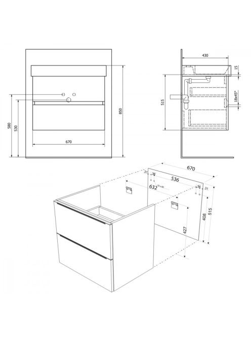 Sapho Filena 2 fiókos mosdótartó szekrény, 67x43 cm, tölgy FSapho Filena 2 fiókos mosdótartó szekrény, 67x43 cm, tölgy F